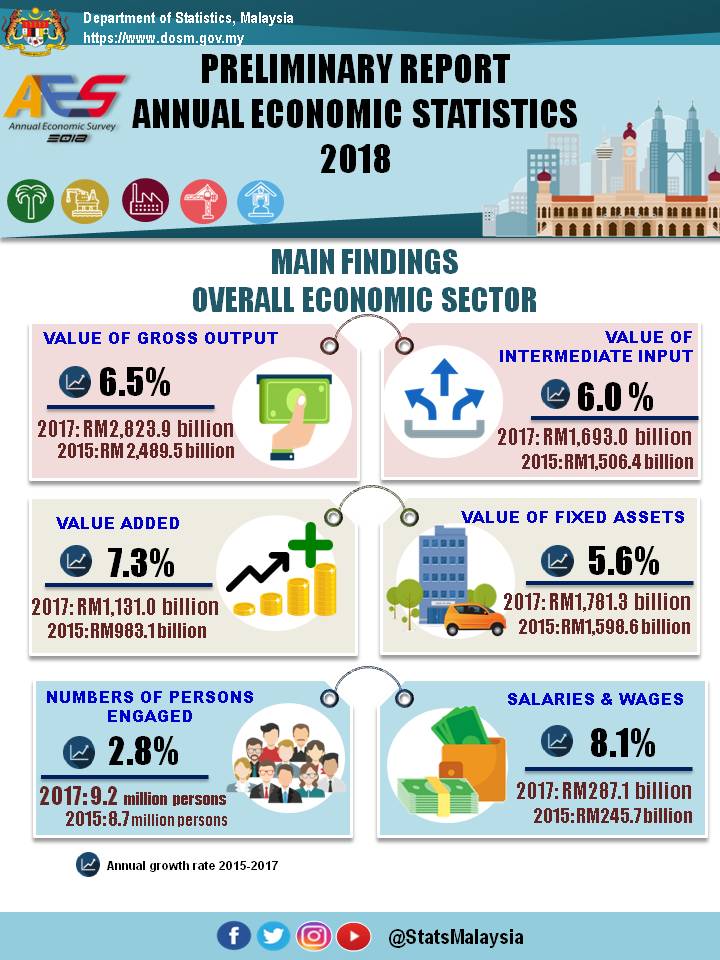 Annual Economic Survey 2018 reference 2017 reveals that the value of gross output registered an annual growth of 6.5 per cent amounting to RM2,823.9 billion compared to RM2,489.5 billion in 2015. Value added also increased 7.3 per cent per year from RM983.1 billion to RM1,131.0 billion within the same period. The number of persons engaged recorded were 9.2 million persons in 2017 as against 8.7 million in 2015 with salaries & wages paid of RM287.1 billion.