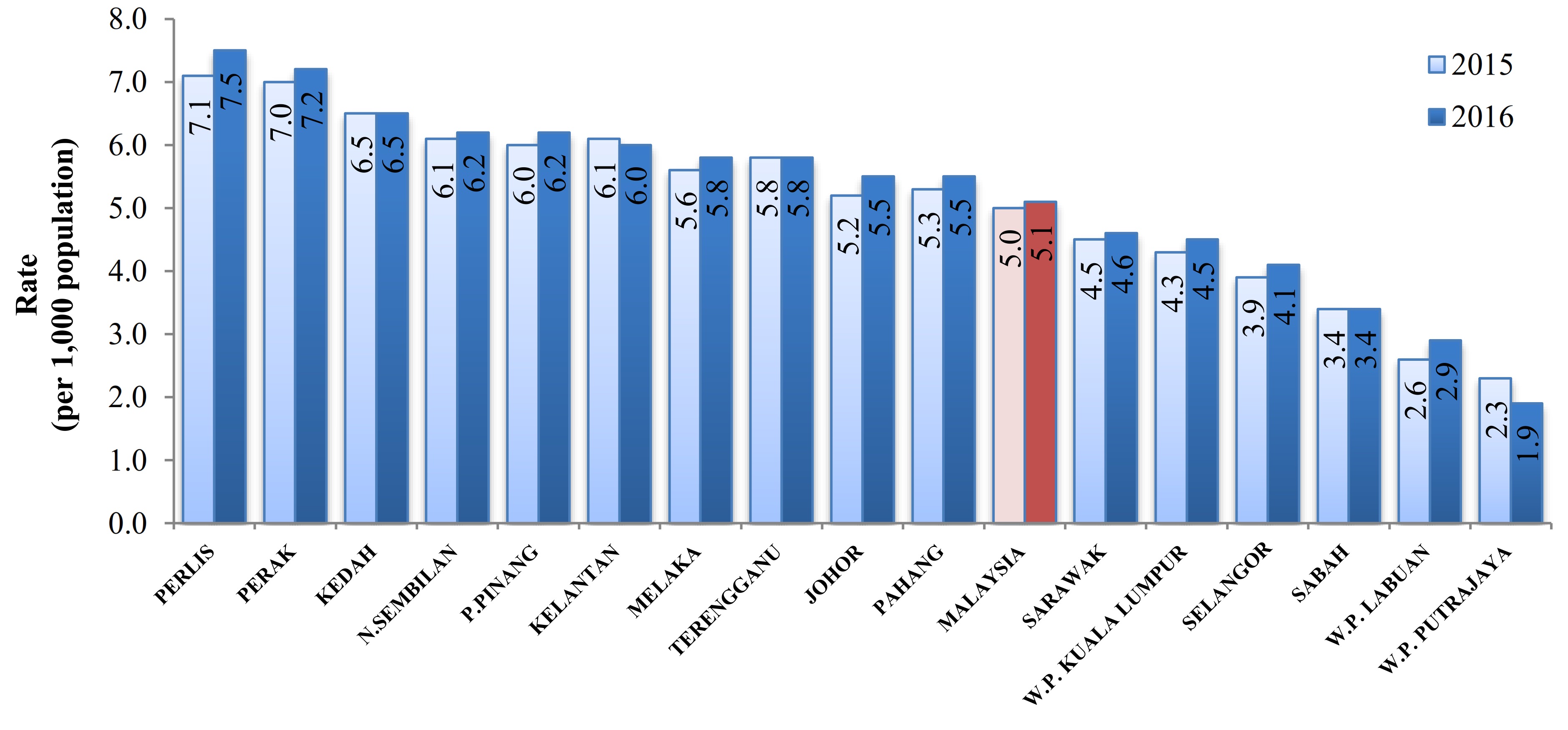 Chart 2: Crude death rate by state, Malaysia, 2015 and 2016