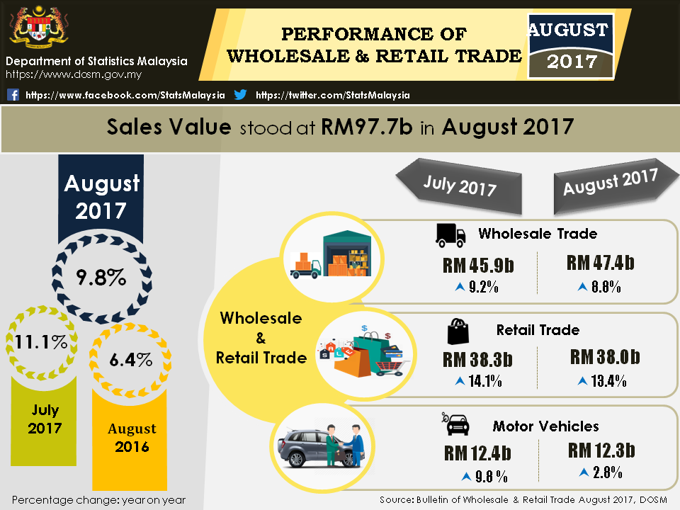 Sales value of Wholesale & Retail Trade stood at RM97.7 billionin August 2017, registering 9.8 per cent growth as compared to the corresponding period in 2016. The sales value consists of Wholesale Trade ( RM47.4 billion), Retail Trade (RM38.0 billion) and Motor Vehicles (RM12.3 billion) businesses.The positive growth was contributed by Retail Trade (13.4%).