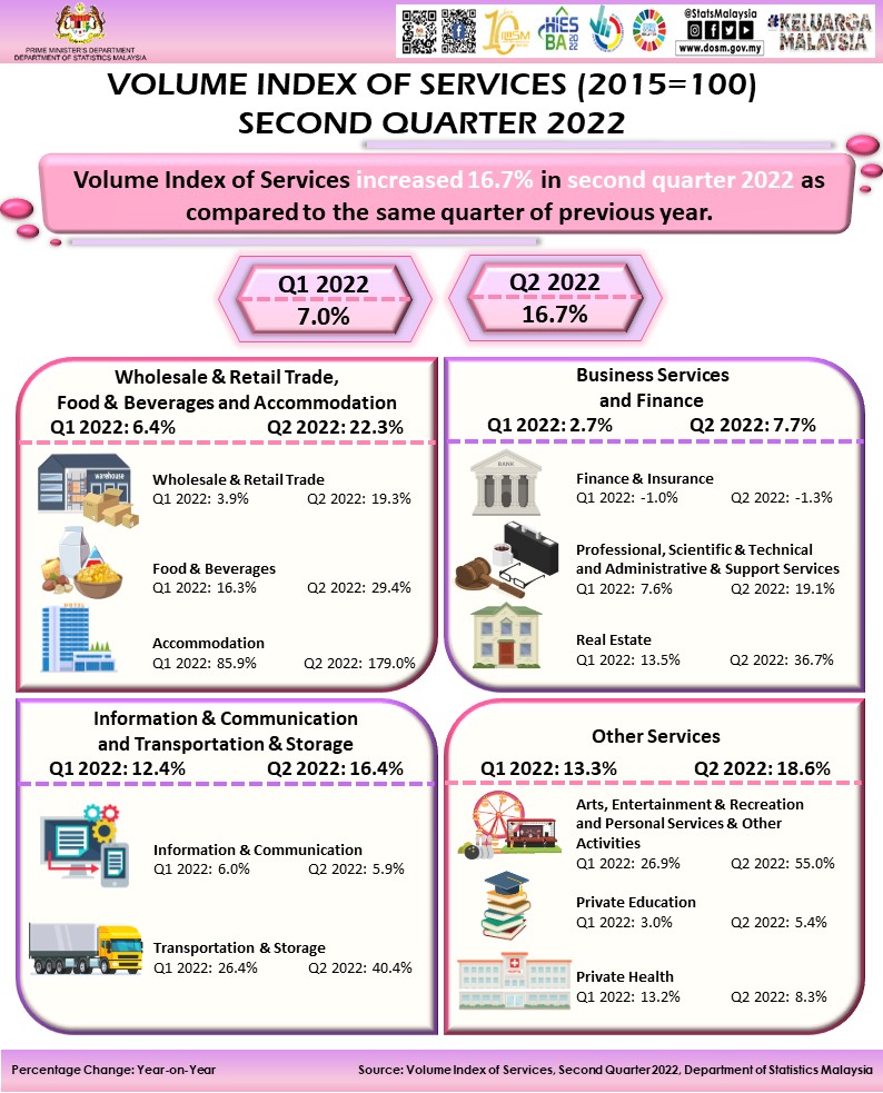 In the second quarter of 2022, Volume Index of Services rose by 16.7 per cent to record 136.3 points as compared to 116.8 points in the second quarter of 2021. This increase was driven by the positive growth of all four segments in the Services sector which were Wholesale & Retail Trade, Food & Beverages and Accommodation segment, 22.3 per cent, Business Services and Finance segment, 7.7 per cent, Information & Communication and Transportation & Storage segment, 16.4 per cent, and Other Services segment, 18.6 per cent.
