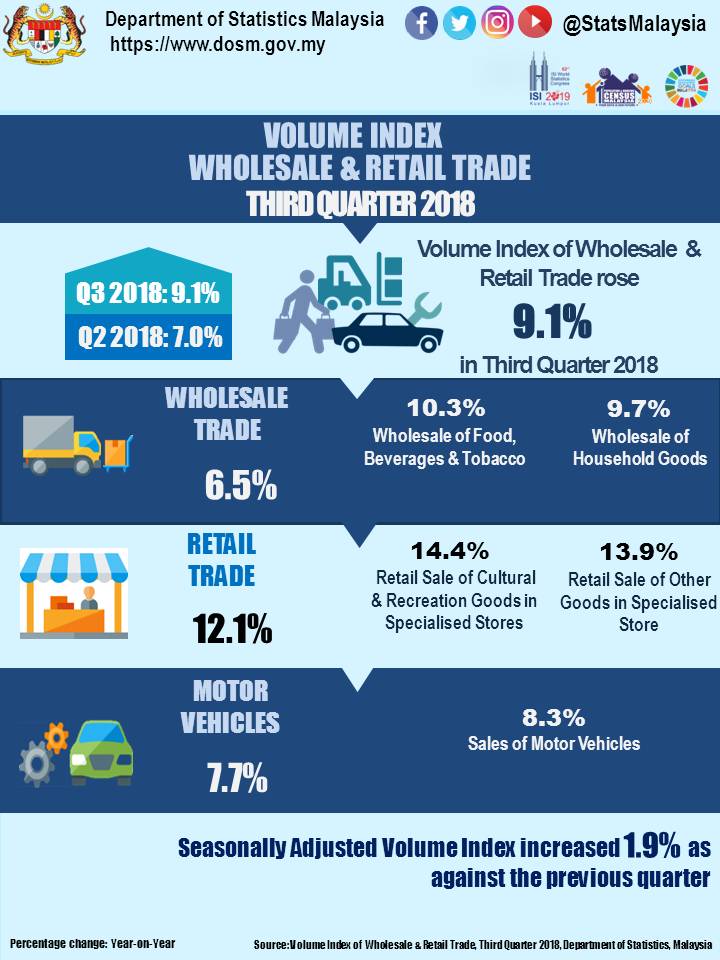Volume Index of Wholesale Trade grew 6.5 per cent to 180.9 points in the third quarter 2018 as compared to third quarter 2017. The growth was supported mainly by Wholesale of Food, Beverages and Tobacco (10.3%), Wholesale of Household Goods (9.7%) and Non-specialised Wholesale Trade (8.0%).