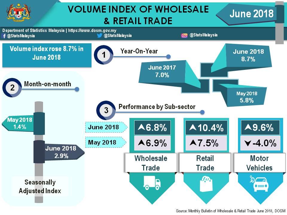 Sales value of Retail Trade recorded an increase of 12.1 per cent to RM42.7 billion as compared to June 2017. Month-on-month, sales value of this sub-sector registered positive growth of 4.5 per cent.