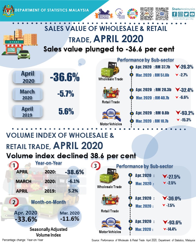 The full publication of the Performance of Wholesale & Retail Trade, April 2020 can be downloaded from eStatistik portal.