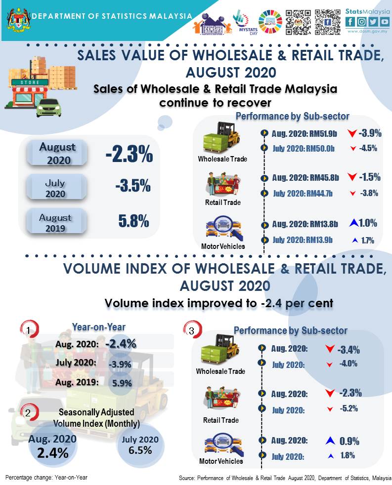 The full publication of the Performance of Wholesale & Retail Trade, August 2020 can be downloaded from eStatistik portal.