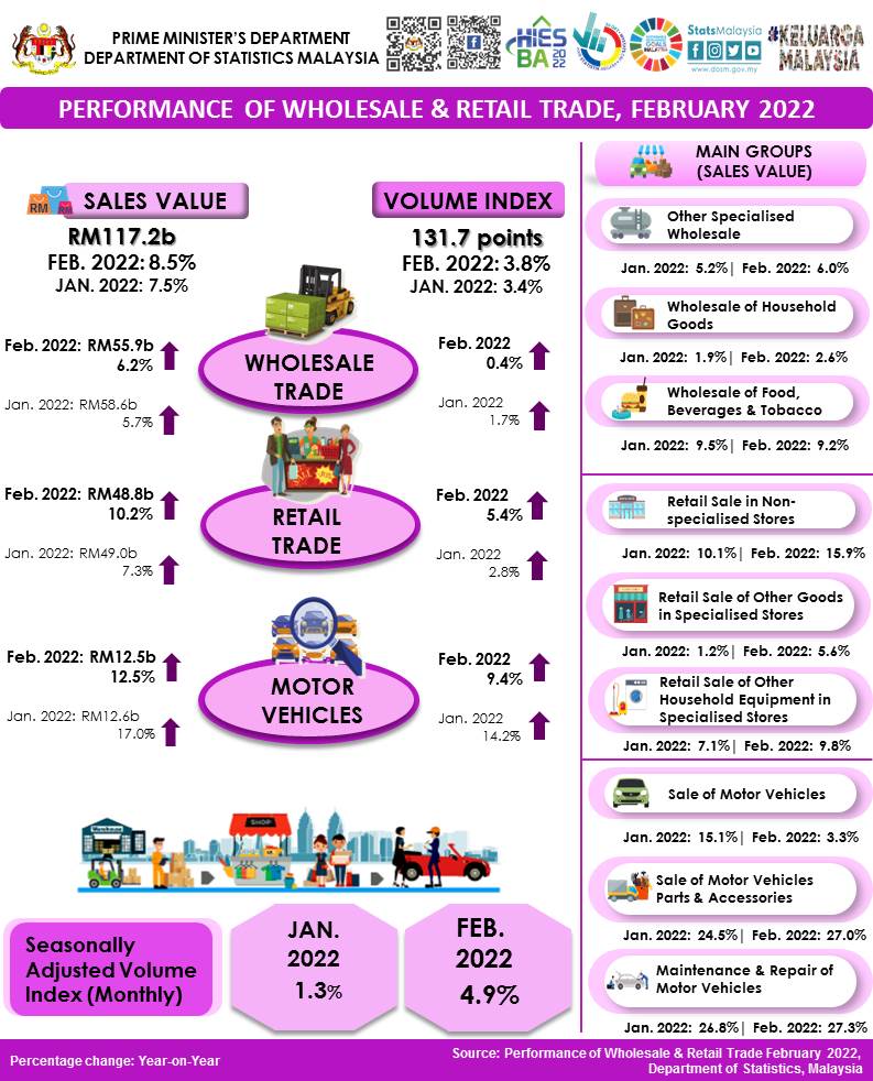 Sales  value  of  Wholesale  &  Retail  Trade  recorded  RM117.2  billion in February 2022, registered a growth of   8.5 per cent year-on-year.  The  positive  growth  was  contributed  by  all  sub-sectors,  namely  Motor  Vehicles  12.5 per cent, Retail Trade  1.2 per cent, and  Wholesale Trade  6.2 per cent.