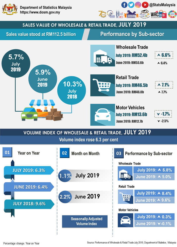 Sales of Wholesale & Retail Trade in July 2019 amounted to RM112.5 billion, grew 5.7 per cent as compared to the same month a year ago. The growth was attributed by Wholesale Trade which recorded an increase of RM3.2 billion (+6.6%) followed by Retail Trade with RM3.1 billion (+7.1%). Meanwhile, Motor Vehicles decreased RM0.3 billion (-1.7%).