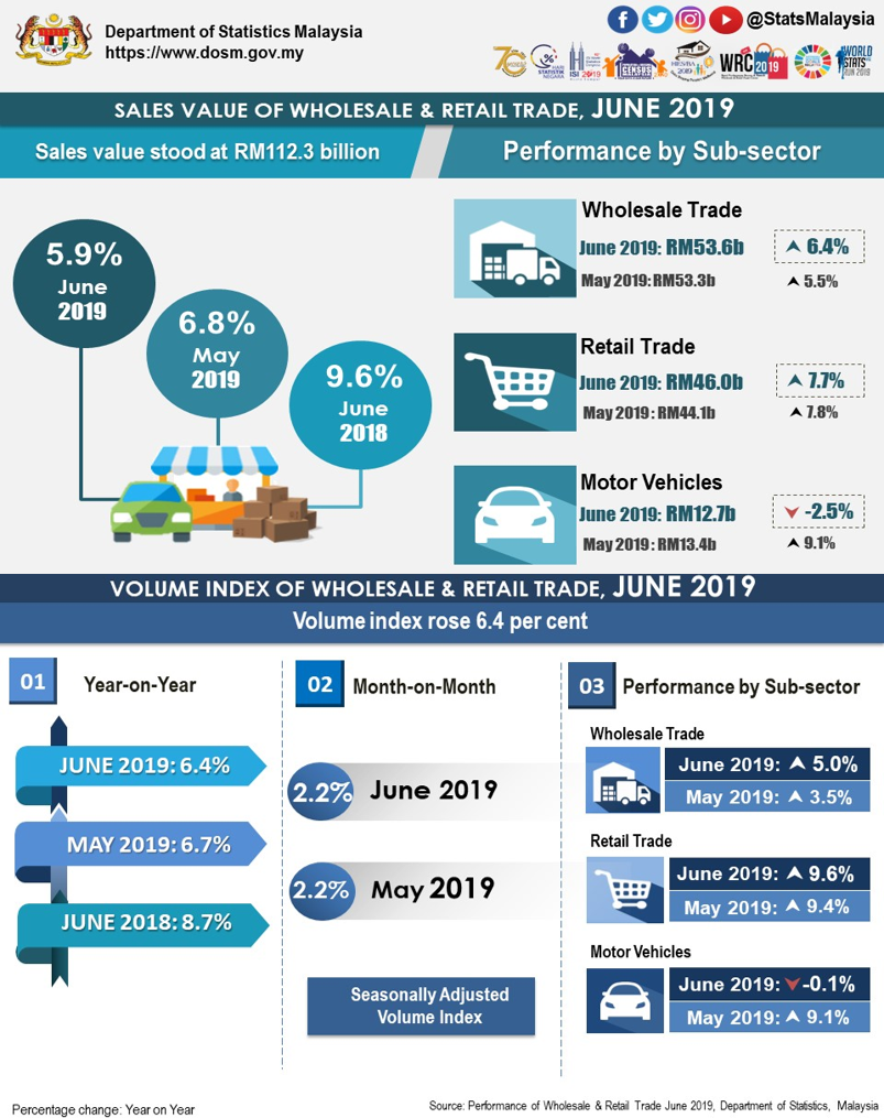 Sales of Wholesale & Retail Trade in June 2019 amounted to RM112.3 billion, grew 5.9 per cent as compared to the same month a year ago. The increase was attributed by Retail Trade which recorded RM3.3 billion (+7.7%) followed by Wholesale Trade RM3.2 billion (+6.4%). Meanwhile, Motor Vehicles decreased RM0.3 billion (-2.5%).