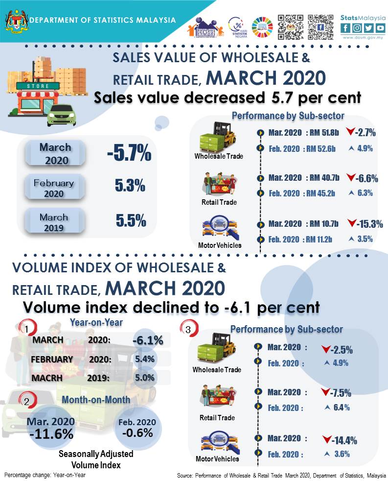The full publication of the Performance of Wholesale & Retail Trade, March 2020 can be downloaded from eStatistik portal.