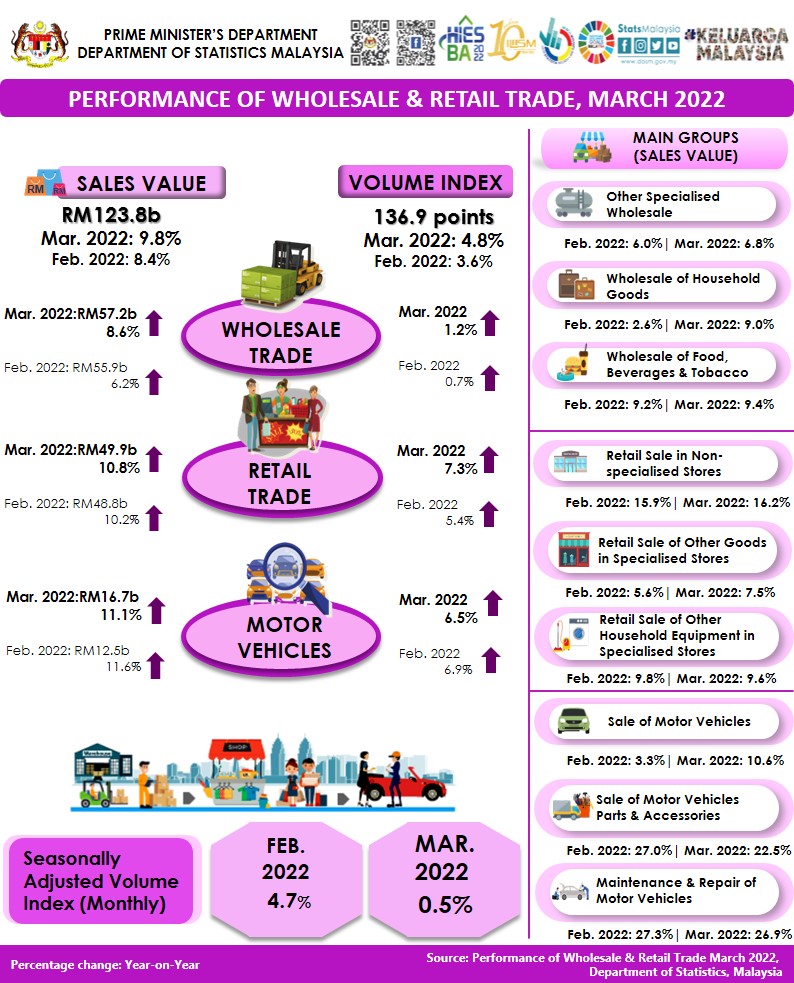The full publication of the Performance of Wholesale & Retail Trade, March 2022 can be downloaded through eStatistik Portal.