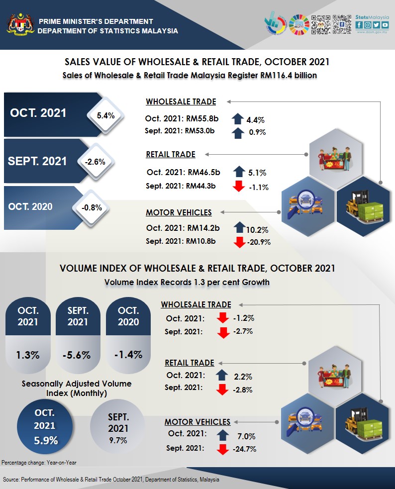 Sales value of Wholesale & Retail Trade recorded RM116.4 billion in October 2021, registered a growth of 5.4 per cent year-on-year. The increase was contributed by all sub-sectors, namely Motor Vehicles 10.2 per cent, Retail Trade 5.1 per cent and Wholesale Trade 4.4 per cent.