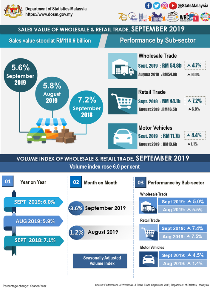 A total of RM110.6 billion was recorded by Sales of Wholesale and Retail Trade in September 2019, grew  5.6 per cent as compared to the same month a year ago. The growth was attributed to Retail Trade which increased RM3.0 billion (+7.2%) followed by Wholesale Trade with RM2.5 billion (+4.7%). Similarly, Motor Vehicles rose  RM0.5 billion (+4.4%).